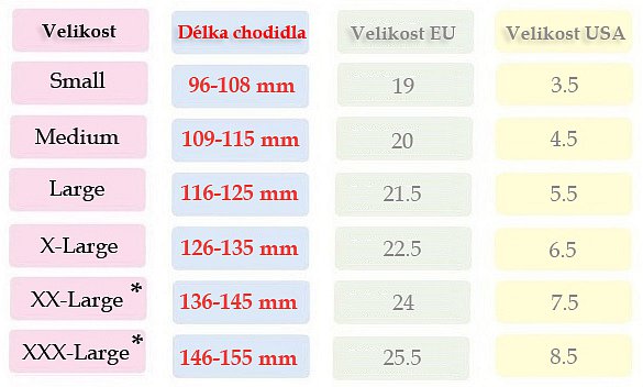 Například: délka chodidla dítěte je 130 mm + 5mm (připočítáváme jako nadměrek). Vyjde nám 135 mm, což odpovídá velikostí XL (126-135 mm).